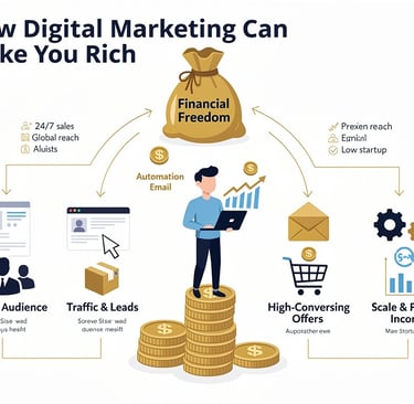 Can digital marketing make you rich? Discover the real income potential, profitable digital marketing skills, business models, and strategies to build sustainable wealth using online marketing.